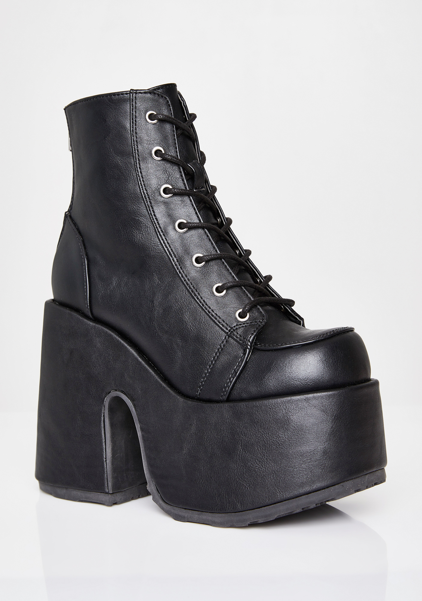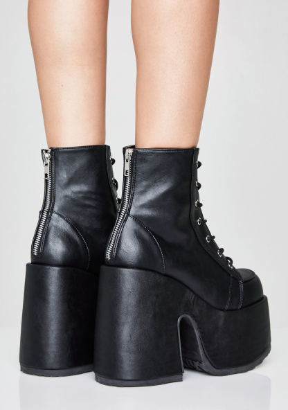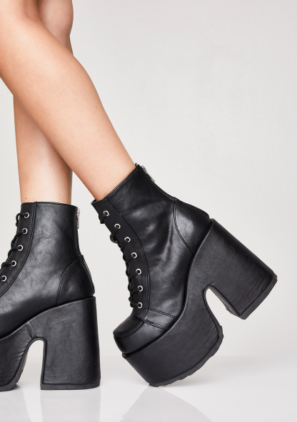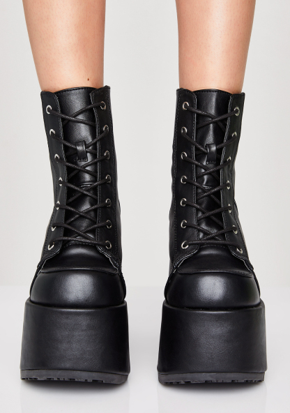 Matte Rave Royalty Platform Boots should we curtsy? These matte vegan leather boots have an ultra thicc platform sole ‘N heel, adjustable lace-ups, and back zip closures.