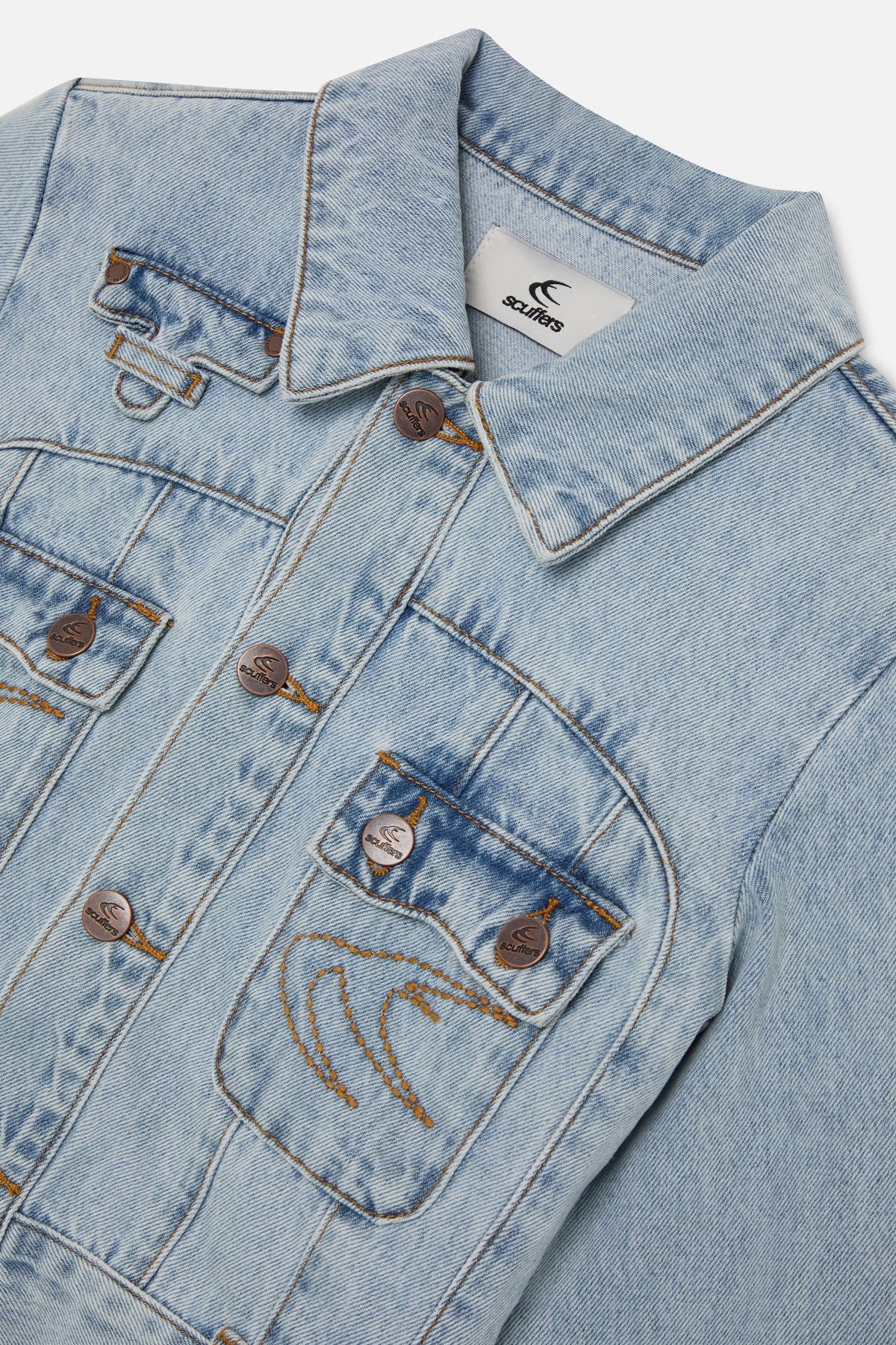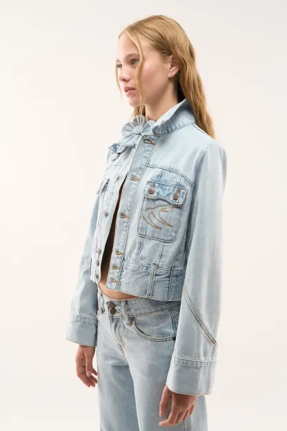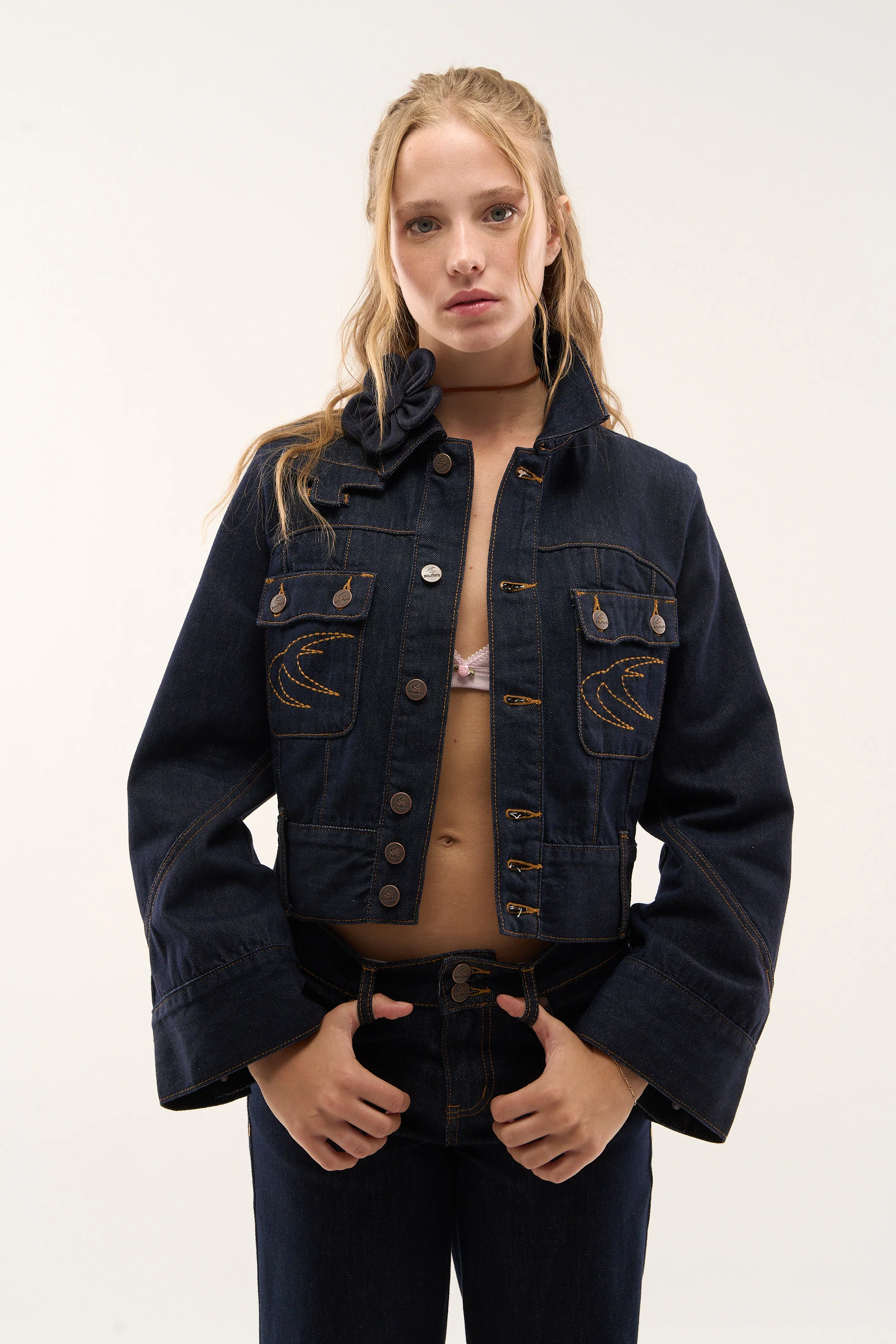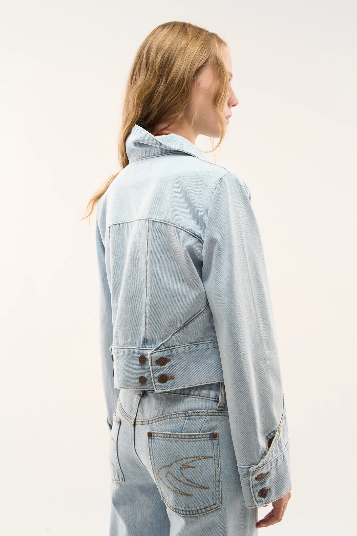 Wash Cropped Denim Jacket made from rigid cotton denim, featuring a boxy fit with a structured collar, flap chest pockets, and button front closure. Detailed with contrast stitching, embroidery on the pockets, and adjustable buttoned tabs at the waist and cuffs.