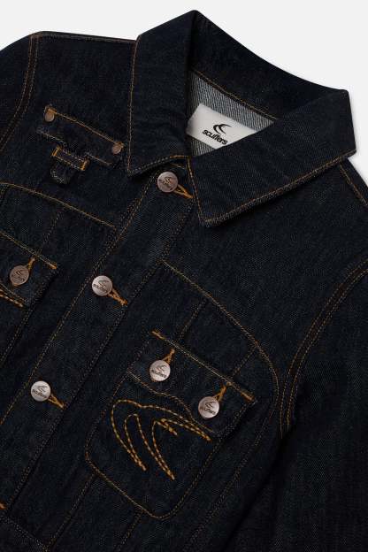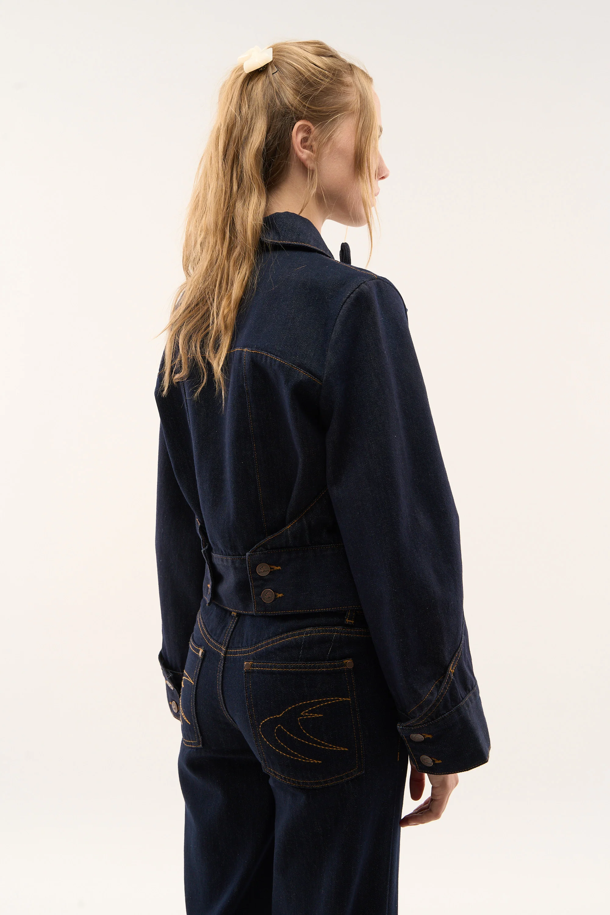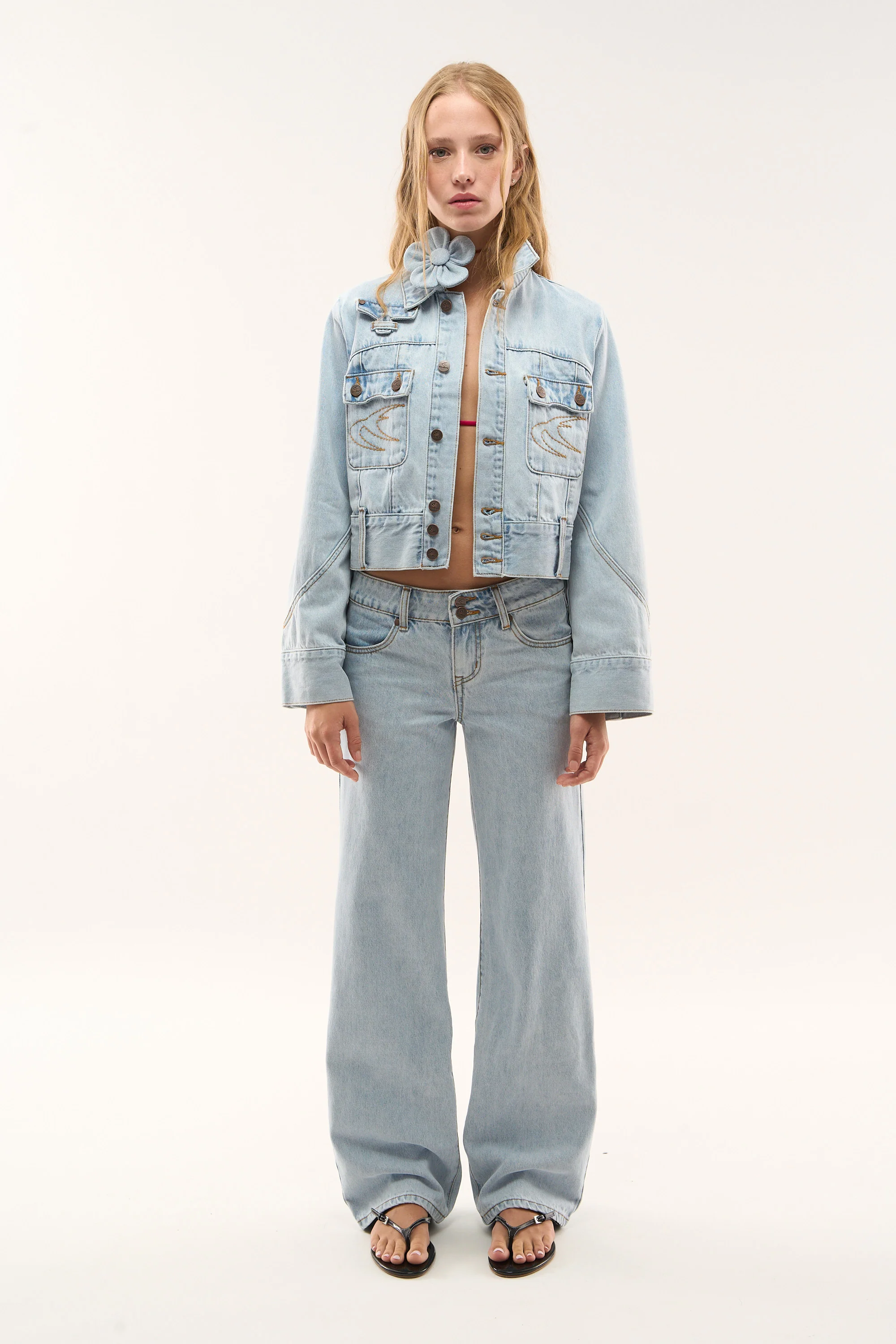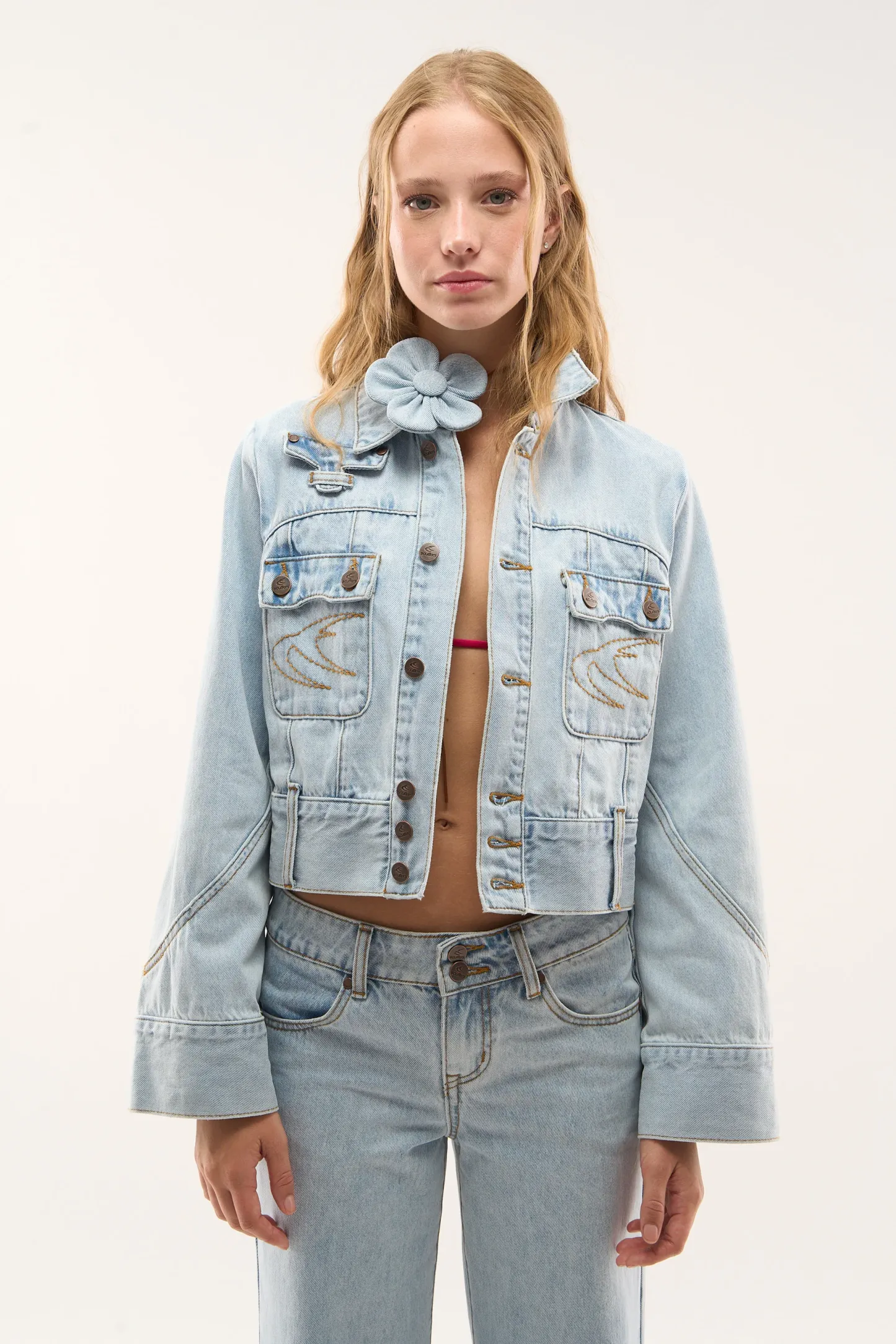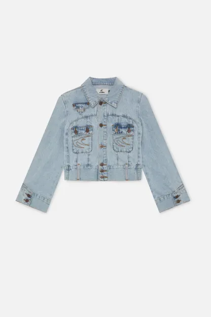 Wash Cropped Denim Jacket made from rigid cotton denim, featuring a boxy fit with a structured collar, flap chest pockets, and button front closure. Detailed with contrast stitching, embroidery on the pockets, and adjustable buttoned tabs at the waist and cuffs.