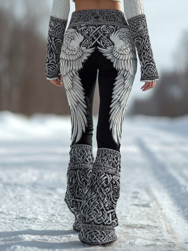 Viking Inspired Angel Wings Pattern Comfy Flared Leggings