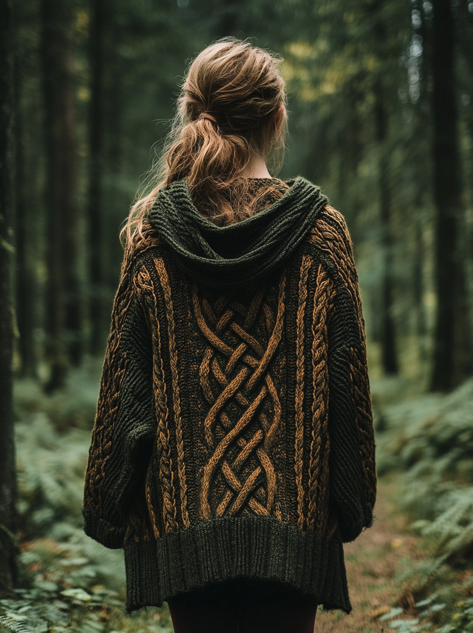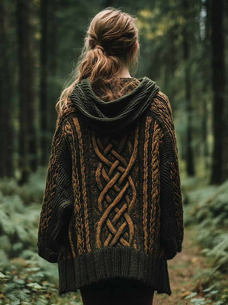 Women's Vintage Irish Celtic Knot Jacquard Mottled Cozy Knit Hooded Cardigan